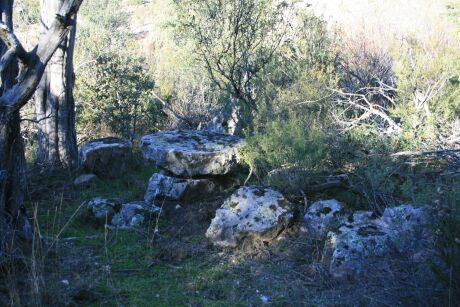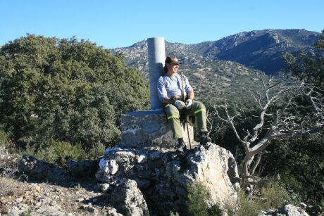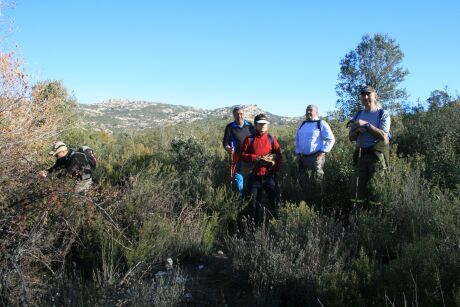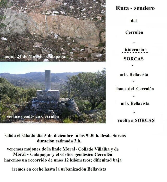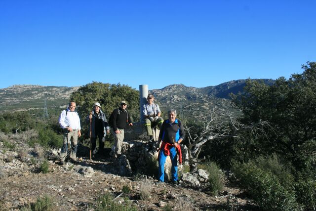 - Ruta del Cerrulén - Esta marcha del mes de diciembre de 2015 se realizó el pasado sábado día 5 y corresponde a la marcha que debía haberse realizado el día 17 del mes de octubre, la cual fue suspendida por lesión del guía, pero a pesar de ello, esta ha sido la trigésimo octava realizada por este grupo desde SORCAS. El tiempo fue muy bueno, lucía el sol y la temperatura era muy agradable, con lo que se podía caminar y no sufrir la calorina de los meses de pasado verano. El cartel que anunció la marcha se muestra aquí abajo y aparece en la parte superior un mojón de la línea divisoria de Moralzarzal y Galapagar, mojón que está al final de la loma del Cerrulén, ya cerca de la carretera de la Coruña, y en la parte inferior se ve el vértice geodésico de Cerrulén, uno de los vértices de la triangulación topográfica de la geografía de España. ![]() Como es norma en todas de todas las marchas que hacemos, quedamos citados en la calle de la Iglesia a la puerta de SORCAS, y en esta ocasión fue a las 9:30 de la mañana de ese sábado y salimos en dos coches para ir hasta la urbanización Altavista de Collado Villalba. En esta ocasión nos reunimos 6 personas y éramos, Eva, que hacía algunos meses que no venía, pues se ha ido de Moral a otro pueblo de la Sierra; Marcelo que es bastante asiduo a salir con nuestro grupo; José Luis, que vino por última vez cuando hicimos una ruta el 13 de diciembre de 2014; Julián, que también ha venido algunas veces pero que desde hace más de un año que no venía y Javier, que estuvo con nosotros por última vez en la marcha del día 15 de marzo del año pasado cuando fuimos al Covacho. Fuimos en los coches hasta la urbanización Altavista, de Collado Villalba, y llegando a la calle de la Perdiz, en dicha urbanización, empezamos a caminar entrando en el Parque Regional de la Cuenca Alta del Manzanares. El tramo primero, de un poco más de medio kilómetro, es una suave subida y llegamos a la pista forestal que viene por la derecha desde la urbanización el Mirador de Collado Villalba, y que por la izquierda lleva hasta el cercano pueblo de Hoyo de Manzanares, siendo conocida esa calle como de Prado Encinas. En ese punto, donde hay un prado a la derecha, esperábamos ver el avestruz que hemos visto otras veces, pero no la vimos en esta ocasión. Seguimos subiendo otro tramo hasta donde se encuentra un desvio a la izquierda que conduce a un depósito de agua y a los senderos que permiten pasar por el Portillejo hasta la parte de atrás de la zona de Canto Hastial y la Peña del Águila. Pasado ese desvio que lleva por la izquierda al depósito dicho, vimos que están haciendo obras para meter nuevas tuberías para llevar el agua hasta Hoyo de Manzanares, y continuamos la marcha pasando por una zona en la que se alternan zonas llanas y ligeras bajadas, pudiendo contemplar a nuestra izquierda los riscos de la formación rocosa conocida como "Castillejos", y siguiendo pudimos ver también a nuestra izquierda el sendero que lleva hasta el alto del Vallejo de la Cierva y la zona de Canto Hastial, sendero que discurre subiendo por el barranco de Contadero. Continuamos por una bajada que comienza cuando se llega a una caseta del Canal de Isabel II que hay a la derecha de nuestro camino, y como íbamos en dirección hacia el este, pudimos ver el gran peñasco que se alza en la parte alta de Cerro Lechuza, y más arriba y a lo lejos, el monte de Peña Herrera. A la izquierda veíamos el arroyo de Contadero, que en esa zona se llama arroyo de la Osea, y pudimos apreciar que llevaba agua, cosa rara ya que hace bastante tiempo que no cae una gota de lluvia. Al final de la bajada cruzamos dicho arroyo y como están metiendo tuberías, me vino la idea que habían tapado un mojón que hay a un treintena de metros a la izquierda en unas rocas de cuarzo, pertenecientes a la veta de Hilo Blanco, y efectivamente los obreros lo habían tapado. Ese mojón esta formado por tres cruces que están grabadas en las rocas y corresponden a un hito de la divisoria de Collado Villalba y Moralzarzal, contemplando también a la derecha una piedra clavada en el suelo que es otro mojón de separación de Collado Villalba y Moralzarzal. Seguimos y a la izquierda está el camino que conduce hasta el mirador de Peñaliendre, lo pasamos y vimos una gran máquina excavadora de las que están trabajando en las obras dichas, y nos desviamos a la derecha por un sendero muy cerrado por jaras y romeros, hasta alcanzar un punto donde se ve un hito de granito clavado en tierra, junto a unas bardagueras y donde se encuentra el manantial de Cabeza Rubia, que es el punto donde confluyen los términos de Collado Villalba, Galapagar y Moralzarzal. A pocos metros vimos una cosa curiosa y es que allí hay una mesa redonda de piedra y bancos también de granito, a la sombra de unas bardagueras y comentamos que era sorprendente ver eso allí. En las fotos siguientes se ve, de izquierda a derecha a José Luis, Marcelo, Eva, Javier y Julián. Al fondo, hacia la izquierda se ve la zona de Canto Hastial y sobre la cabeza de Marcelo se aprecia Peña Herrera, y en la foto de la derecha se puede ver la mesa y los bancos de piedra. ![]() ![]() Volvimos sobre nuestros pasos y una vez en el camino que traíamos nos dirigimos a las torres de alta tensión que hay allí y alcanzando una valla de piedras de cuarzo, pasamos al otro lado después de salvar una alambrada y ver un letrero que advierte de "peligro colmenas". Cogimos otro camino forestal que iba bajando y al poco tomamos otro a la izquierda que subía hacia la parte alta de la loma de Cerrulén. Llegamos hasta la parte alta y al toparnos con una alambrada fuimos hacia la derecha, siguiendo la alambrada, después de haber visto un hito clavado en la tierra, que es uno de los mojones de la línea divisoria de Galapagar y Moralzarzal. Continuamos caminando y al cabo de un corto espacio de tiempo nos encontramos el mojón del vértice geod