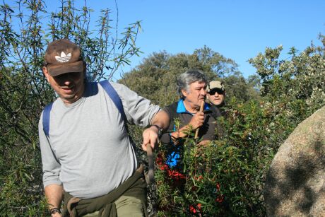 - Ruta sendero del mirador de la Dehesa y la Cañada Real Segoviana - Esta cuarta marcha de 2015 se realizó el sábado día 23 de mayo de este año 2015, y el tiempo nos acompañoacute; durante el desarrollo de la misma, con una temperatura muy agradable. El cartel que anunciaba la marcha se muestra seguidamente y no se hicieron las copias acostumbradas para colocarlas en los lugares donde normalmente se exponen, por un desacuerdo entre la imprenta y Sorcas, sin ninguna mala intención. En la parte superior se ve el mirador de la Dehesa, y una vista de lo que se encuentra alfrente, y en la parte inferior se muestra uno de los mojones de la Cañada Real Segoviana. ![]() La marcha se realizó ese día 23 de mayo y salimos 10 personas entre las que se encontraban Margarita y Titina, nuevas incorporaciones, Carlos ya veterano en estas salidas al campo, la pareja de la Herradura formada por Nieves y Carlos, Marcelo y su hijo, que ya han venido en otras ocasiones, Agnès, que de vez en cuando viene con nosotros, Miguel Ángel Soto y yo. Como es norma en todas las marchas que hacemos, quedamos a la puerta de SORCAS a las 9:30 de la mañana de ese sábado día 23 de mayo y salimos por la calle de la Huerta y luego por la avenida de Salvador Sáchez Frascuelo hasta alcanzar la calle vía del Berrocal y nos encaminamos a la calle Borricoparra para pasar por delante del camping de Herrenes. Pasado el camping, tomamos un sendero que sube pegado a la tapia de la Dehesa Nueva y llegamos hasta el depósito de bombeo del Canal de Isabel II, y pegado a ese depósito pudimos ver una rareza en una planta llamada viborera o lengua de buey, cuyo nombre científico es Echium vulgare, y la rareza consiste en tener el tallo plano con una anchura de unos 5 centímetros y con las flores en la parte alta de ese tallo. Allí tomamos una pista forestal y por ella fuimos hasta el punto más alto de ese camino, en el que se encuentra el mirador de la Dehesa Nueva, y pudimos ver la labor desarrollada por los gamberros que han roto por tercera vez el panel indicador de lo que desde ese punto se puede contemplar mirando a la Sierra. y eso hicimos, ver los montes que hay enfrente, el Montón de Trigo, Siete Picos, la Maliciosa, las Cabezas de Hierro, la Sierra de los Porrones y los canchales de la Pedriza, además de los pueblos como Navecerrada, Becerril, Boalo, Mataelpino, Cerceda y Manzanares el Real. Esa pista forestal es el Cordel de la Cerca de Arriba o Dehesa, lo que quiere decir que es una vía pecuaria de un ancho de 45 varas castellanas, midiendo la vara cerca de 84 centímetros. En las fotos que siguen, se ve a parte del grupo en el mirador de la Cañada, pudiéndose apreciar de izquierda aderecha a Margarita, Marcelo, Agnès, Carlos y Nieves que tapa a su marido Carlos. En la foto de la derecha, después de haber visto la cantera de gabarro de la Dehesa Nueva, se ve a Margarita en primer lugar seguida de Carlos y el resto un poco más distanciados. ![]() ![]() Continuamos la marcha bajando por ese Cordel, pero al poco de empezar a bajar, saltamos la tapia de la Dehesa Nueva para acercarnos a ver la cantera de gabarro que hay allí y en una zarza pudimos contemplar una agalla de las formadas en esa mata de escaramujo o Rosa Canina, agalla inducida por una avispilla y la cual se veía muy pequeña al ser de reciente formación, puesto que estamos en primavera y esos insectos ponen los huevos en esta época. Seguimos bajando por ese Cordel que discurre entre la Dehesa Nueva a la izquierda de nuestra marcha, y tiene a la derecha el Monte del Marqués, y al final de la bajada se encuentra con la Cañada Real Segoviana. Al llegar casi abajo, antes de tomar la Cañada, pudimos ver un mojón de la línea divisoria de Moralzarzal y Cerceda, consistente en una M, una C y una cruz grabadas en una piedra de la tapia del Monte del Marqués, y contemplando un rebaño de vacas entre las que había un hermoso toro, pudimos escuchar a Agnès cuando tocaba la flauta, una estampa complétamente pastoril. En las fotos que siguen, se ve a parte del grupo junto al mojón, pudiéndose apreciar de izquierda aderecha a Marcelo, Carlos y Nieves que tapan al hijo de Marcelo, Agnès y Miguel Ángel. En la foto de la derecha, después de haber visto el mojón y entrando ya en la Cañada, se ve en primer lugar a Carlos seguido de Marcelo, Miguel Ángel y el resto por detrás. ![]() ![]() Reemprendimos la marcha y torcimos a la derecha para incorporarnos a la Cañada Real Segoviana y al poco vimos a la izquierda de nuestro camino un hito de los que marcaban las cañadas antiguamente y después nos cruzamos con un vecino de Moral, Antonio Saavedra, que entonó algunas canciones de cuando hacía marchas en sus tiempos de montañero. Seguimos caminando por la Cañada y al cabo de un rato nos vimos ante el hermoso chalet conocido como la casa de Torrego (D. Agustín), persona que lo compró a los antiguos propietarios, los marqueses de Torrelaguna. Pasado ese "palacete" tomamos un camino que sale a la izquierda de esa zona amplia conocida como "descansadero del Chaparral Gordo o Cerrillo de la Cabaña", camino que es denominado, dentro del mundo de la trashumancia, como la "Colada de los Chaparrales" y llegamos hasta la zona del puente de Madrid que es conocida como "Descansadero Abrevadero de la Mina al puente Madrid". Desde allí tomamos un sendero que va bordeando el río Navacerrada o Samburiel, y en medio de esa sendero pudimos ver muerto un ejemplar de eslizón, y también vimos algunas zonas con restos de excavaciones mineras que se hicieron por donde pisábamos, zona que es conocida como el Chaparral de la Mina. Seguimos por ese sendero cercano al río y al poco lo dejamos y continuamps por el sendero hasta alcanzar la Cañada, teniendo a la izquierda la alambrada que cierra el Chaparral del Marqués y a la derecha la finca Matalacuerda, camino que también es denominado "Colada del arroyo Collado", y una vez en la Cañada, caminando e
