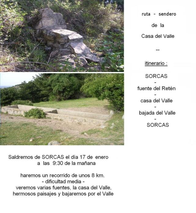 - Ruta sendero de la Casa del Valle - Esta primera marcha de 2015 se hizo el sábado día 17 de enero de este año, estando el tiempo fresco pero agradable por lucir el sol, y como el día anterior hubo obra de teatro y muchos de los senderistas trasnocharon, por la mañana se quedaron dormidos como me dijeron algunos, que estaban despiertos a las 7:00 de la mañana, pero que se quedaron esperando un poco y finalmente se quedaron en la cama yse despertaron a destiempo, y también algún otro se excusó por encontrarse griposo. Los carteles que anunciaban la marcha y que pudieron ser vistos por el pueblo en los lugares habituales, eran como el que se muestra a continuación, y en la parte superior se ve la antigua fuente de la casa del guarda y en la parte inferior se ven los pilones más modernos que hay junto a la casa. ![]() La marcha tuvo lugar ese sábado día 17, saliendo, como ya es habitual, desde la calle de la Iglesia, donde se encuentra el club social de SORCAS, a las 9:30 horas de la mañana y hubo tres incorporaciones nuevas, Alfonso, Enrique y su esposa Maribel. Otra de las personas que nos acompañó es Carlos, que ya no falla en ninguna de las marchas. En esta primera marcha de 2015, salimos por la calle de la Iglesia para tomar la de las Camachas y entrar a continuación en la calle del Arroyo Grande, viendo al entrar en ella, a la izquierda, el prado que antiguamente era propiedad de un vecino de este pueblo y que permutó por la herrén Concejo, propiedad antiguamente del Ayuntamiento, lugar donde se encuentra actualmente el centro Choko Maite, entre las calle de la Fuente y la de la Iglesia, es decir, la marcha se realizó empezando por terreno llano hasta llegar a la zona del Melojar y luego continuó con una subida hasta el antiguo vivero y la fuente del Retén, para seguir luego por zona llana y bajar seguidamente por el Valle hasta tomar la calle camino de Alpedrete hasta el pueblo. Una vez en la calle del Arroyo Grande, llegamos hasta cruzar ese arroyo y alcanzada la llamada barrera o paso canadiense que hay a la altura del Melojar, subimos hasta la barrera que hay en el cruce cercano al vacunadero del Cerrillo de las Pozas, que por la derecha lleva hasta la carretera M615, de Moralzarzal a Mataelpino, de frente se va hacia Becerril de la Sierra y encaminándonos por la izquierda, pasamos la barrera y al poco de pasar una torre de una línea de alta, tomamos el antiguo camino que se usaba para ir a Collado Mediano. Siguiendo ese camino cruzamos la vía de servicio del Canal de Isabel II que da acceso al depósito de agua Retamar y un poco más arriba cruzamos la antigua conducción de agua que la traía desde la presa de Navacerrada y llegamos al ensancho de Frascuelo, zona más ancha que se cruza hasta llegar a la pista forestal que lleva hasta el alto del Telégrafo. Seguimos subiendo y a nuestra derecha dejamos la cantera del Gurugú y salimos a la izquierda para ver la fuente de la Penosilla, que echaba un chorrito de agua y llegando a una curva hacia la izquierda, donde se encuentra un pilón y en el que se veía el hermoso chorro de agua que salía del caño, nos desviamos a la derecha para ver el antiguo vivero que sirvió de base para la repoblación forestal en tiempos anteriores y posteriores a la guerra civil de 1936. Allí vimos un pequeño estanque, los canales perra llevar agua a las terrazas y finalmente pudimos ver la cabaña que usaba al guarda forestal y que le servía de refugio en tiempo de inclemencias. Abajo de estas líneas, se muestra un par de fotos en las que se ve, en la de la izquierda, a cuatro de los que se apuntaron a esta marcha, justo cuando entramos en el antiguo camino a Collado Mediano, y en la otra foto de la derecha se va a Alfonso, Enrique y su mujer Maribel dentro de la cabaña. ![]() ![]() Continuamos el camino y llegamos a la fuente del Retén, donde bebimos agua y Enrique tiró la que llevaba en una cantimplora, diciendo que era mucho más rica la de la fuente, y reemprendiendo el camino subimos un poco hasta alcanzar un desvio que hay a la izquierda, y que nos llevó hasta la pradera donde se encuentra el pilón de la casa del Valle, los restos de la casa y subiendo otro poco, vimos lo que queda de la antigua fuente de la casa del guarda. Comenzamos a bajar por el Valle y nos dirigimos hacia un chopo que hay en el margen izquierdo del arroyo del Valle, para ver una de las arquetas construidas en los primeros años de 1920, y que llevaba el agua al depósito de Matarrubia, en la Ladera, cerca ya del pueblo. Después de estas líneas, se muestra otro par de fotos en las que se ve a parte del grupo una vez que tomamos el desvio que desde la fuente del Retén nos llevó a la pradera donde está la casa del guarda, y en la foto de la derecha se muestra lo que queda de la antigua fuente de la casa del Valle. En la de la izquierda se ven de izquierda a derecha a Alfonso, Carlos, Enrique y Maribel. ![]() ![]() Vimos junto a la arqueta una bonita estampa del agua saliendo por una raja de una roca que allí hay, formada por el arroyo del Valle, y de nuevo reemprendimos la marcha bajando hasta los prados del Valle, pudiendo contemplar lo que ha hecho José Luis el apicultor, con las colmenas en la vertiente que da al este y que recibe bien los rayos del sol, y además la reforestación que ha iniciado, de manera que las abejas tengan de dónde comer. Seguidamente se muestra lo dicho del agua saliendo de la raja de la roca, que en esta época da gusto ver como hay agua por todas partes. ![]() Continuamos bajando y alcanzamos la calle camino de Alpedrete, por la que nos encaminamos hacia el pueblo, despidiéndonos en la confluencia de esa calle y la de la Valleja, pues Enrique y Maribel se desviaron por esta última para irse a su casa. En la siguiente foto de la izquierda se aprecia a Carlos, Enrique, Maribel y Alfonso, cuando comenzamos a bajar por el Valle, y a la derecha aparecen de izquierda a derecha a Maribel, Alfonso y Enriqu