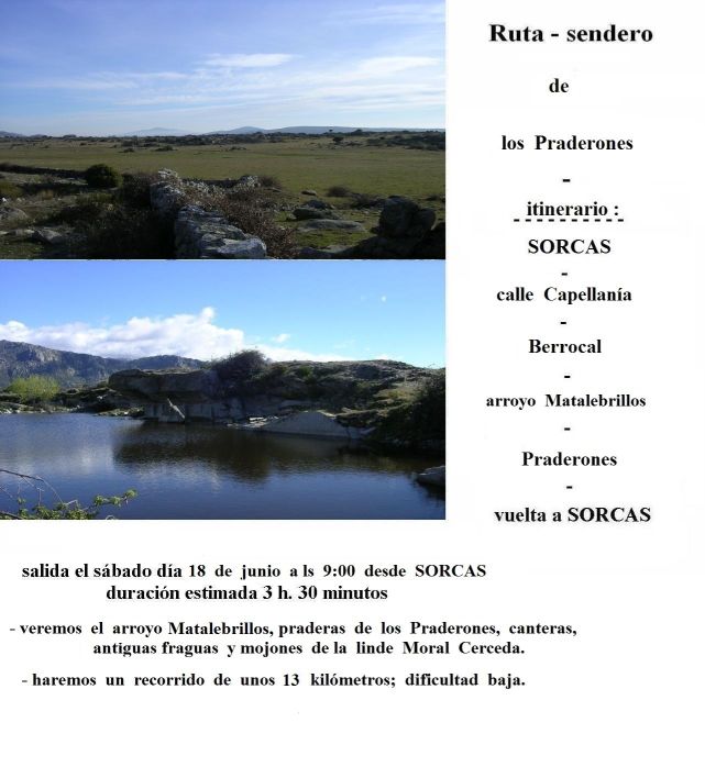 - Ruta de los Praderones - Esta sexta marcha de 2015 se realizó el sábado día 18 de julio de este año 2015, y el tiempo fue caluroso, aunque salimos media hora más pronto que en la mayoría de las marchas hechas y además el terreno no tiene apenas zonas de sombra. El cartel que iba a anunciar la marcha se muestra debajo de esta líneas y no se pudieron ver en los lugares donde normalmente se exponen, por el motivo que se dice líneas abajo. En la parte superior se muestra una vista general de los Praderones, lugar que es utilizado por los ganaderos para que su ganado coma ese rico pasto que allí se da, y en la parte inferior se muestra una de las canteras que se pueden contemplar en esa zona, en este caso es la cantera conocida como Lanchaloya, que fue explotada por el vecino de nuestro pueblo llamado Macario Segovia Bordón. ![]() La marcha se realizó ese día 18 de julio (otro fallo del cartel es que pone de junio) y salimos solamente 3 personas que fueron Carlos Martínez, Miguel Ángel y yo, por un motivo muy simple, no fue anunciada porque hubo fallos de logística y no se hicieron los carteles debido a una serie de malos entendidos, aunque Carlos se enteró al verlo en esta web. Como es lo normal en todas las marchas que hacemos, quedamos en la calle de la Iglesia a la puerta de SORCAS, y en esta ocasión fue a las 9:00 de la mañana de ese sábado y salimos media hora antes de lo acostumbrado normalmente, con el fin de evitar un poco el calor de esta época del año. Salimos por la calle de la Huerta, pasando por la plaza de toros y cruzamos la Dehesa Vieja para salir cerca de la urbanización la Herradura y allí tomamos la calle camino de los Linares, por la que se llega a ellos. Seguimos por la calle Capellanía en dirección al Berrocal, y antes de llegar al río Navacerrada, vimos un mojón del límite de Cerceda y Moralzarzal que hay junto a un paso canadiense cercano al río y junto a la tapia de la Cerca Rasa. Cruzamos el río, que estaba sin una gota de agua, pues está cortado donde las depuradoras de Becerril, y por el polígono de Capellanía llegamos a la carretera M607, que desde Madrid viene por Colmenar Viejo y llega al puerto de Navacerrada, la cruzamos y pasamos a un prado para tomar el camino de Peña La Fragua y al poco nos encontramos junto al arroyo de Matalibrillos a la izquierda de nuestro camino. El arroyo ya estaba seco como suele ocurrir en estas fechas del año y nos dirigimos a donde se encuentra una piedra bastante larga y de una anchura como de unos sesenta centímetros que hace de puente para cruzar el arroyo, viendo a continuación de esa piedra una brincadera para poder cruzar la tapia y pasar al prado cercano. A un lado del arroyo se encuentra una lancha de granito con una AP grabada y en otra hay grabada una cruz. En la orilla opuesta hay otra lancha en la que con bastante atención, ya que no está pintada, se puede ver la inscripción que dice : Aquí se ahogó Antonio Duque, año de 1834 Allí conté brevemente quién era esta persona y para los que lean la descripción de esta marcha, pueden ver más información en el apartado de esta web que describe curiosidades encontradas en los campos del pueblo, se puede ver información relativa al "ahogado" y fotos relativas a ese tema, pero una vez que vimos lo dicho anteriormente. En la foto siguiente se ve a Carlos y a Antonio, el que os cuenta estas andanzas, sentados en la lancha de la orilla del arroyo, donde está la inscripción dicha anteriormente y en la que sufrí un buen resbalón debido a la arena que hay en la piedra y restos de vegetales que la hacen muy resbaladiza. ![]() Continuamos nuestra marcha y dejando a la izquierda unos corrales y embarcadero de ganado bovino, abrimos una puerta metálica, pasamos y la volvimos a cerrar para que no se escape el ganado que por allí pace y llegamos a una cantera que es conocida como la de la Fragua, y es que junto a ella se encuentran los restos de una fragua usada por los canteros para aguzar sus herramientas sin tener que llevarlas a las fraguas del pueblo, restos que se encuentran al pie de un hermoso ejemplar de majuelo o espino albar junto al cuál pudimos refrescarnos a su sombra durante unos instantes, ya que el día estaba caluroso. En las fotos que siguen, se ve a Carlos y Miguel Ángel cuando íbamos por el camino de la Peña de la Fragua, camino que lleva hasta el vecino pueblo de El Boalo y en la otra foto se les ve junto a la cantera de la Fragua en la que hay una charca y con el agua que mana, nunca está seca. ![]() ![]() Continuamos la marcha y fuimos a ver otra cantera que fue explotada por Macario Segovia y en la que trabajó su hijo Cándido y es la cantera conocida como la de Lanchaloya, nombres de canteras que me dijo Andrés Segovia, hijo de Macario. En esta cantera hay otra charca formada por el agua que mana y pudimos ver crustáceos y donde hay también otros seres vivos entre los que se encuentran carpas dejadas en sus aguas hace muchos años y que se han reproducido en esa charca. En una lancha que hay en la parte alta y que sobresale de la cantera a modo de balconada, pudimos ver grabadas una cruz, una M y una C, lo que define uno de los mojones de la línea divisoria de Moralzarzal y Cerceda. Siguiendo nuestro recorrido fuimos por esa parte de los Praderones caminando cerca de una tapia y vimos otra cantera, seca en esta época del año, y en una roca pegada a la tapia vimos las marcas que forman el mojón del punto de conjunción de Cerceda, Manzanares el Real y Moralzarzal, pues en esa zona se encuentra un enclave de Manzanares el Real que se interpone entre los términos de Mataelpino y Moralzarzal, con lo que no lindamos con Mataelpino. Visto ese mojón continuamos la marcha y llegamos a otra zona de canteras en la que hay una caseta, remozada en 2013, que era usada por los canteros para cobijarse en tiempo desapacible de lluvia o nieve, usada también para guardar la comida, herramientas y efectos pers